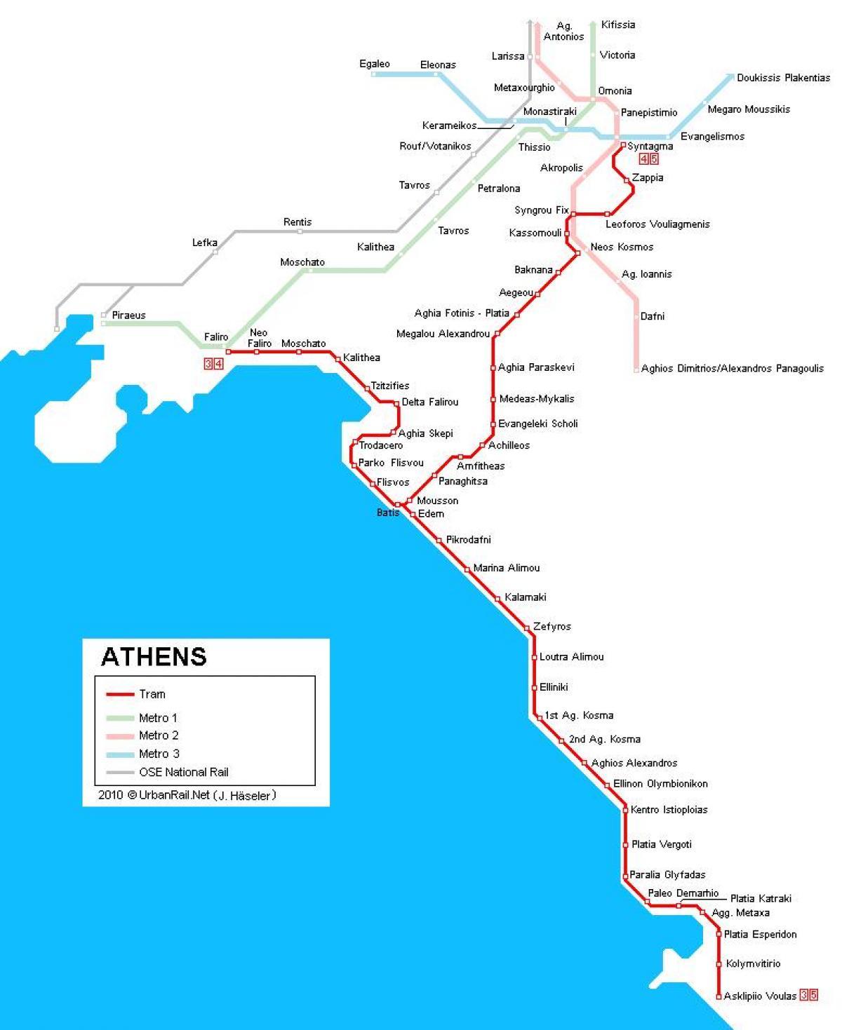 הטראם באתונה מספקת שני קווי רכבת התחתית: קו 6 (T6) וקו 7 (T7). קו 6 מתחיל בכיכר סינטגמה במרכז אתונה ונוסע לדרום-מערב לחוף, ומסתיים בתחנת פיקרודפני. קו 7 נוסע לאורך החוף, מתוך דרום העיר בתחנת אסקליפיו וולאס ועד צפון העיר בתחנת אגיה טריאדה בפיראוס. בתוך פיראוס, השירות פועל בלולאה חד כיוונית. נקודת ההעברה בין שני הקווים נמצאת בתחנת פיקרודפני.